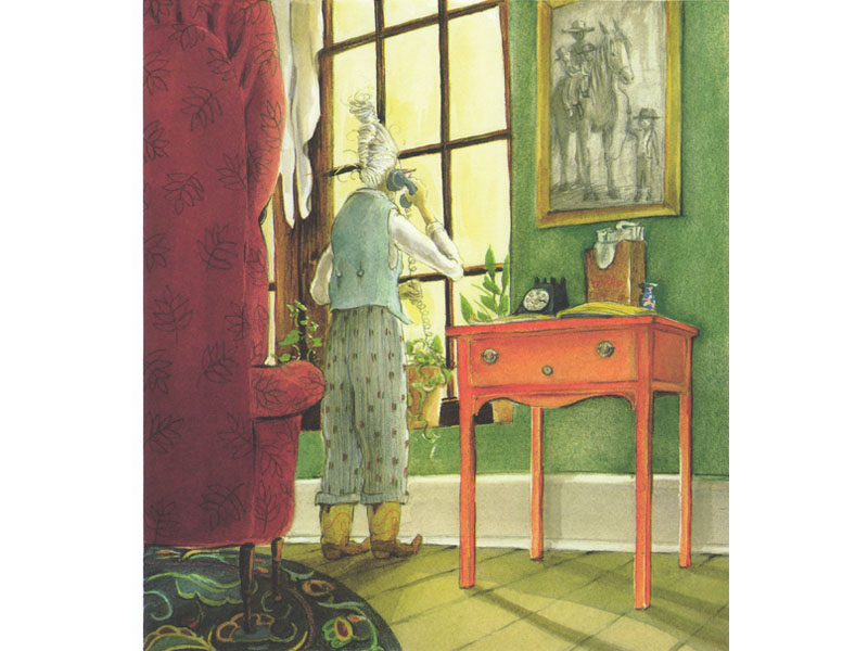 Щенок убежал, а на следующий день вернулся снова. Старушка смотрела на него через окно, и Никиту заворожила эта иллюстрация: