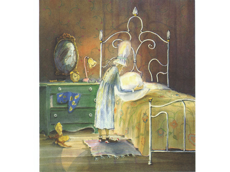 Щенок убежал снова, а старушка осталась. В мыслях о щенке она готовилась ко сну, и на голове ее красовался высокий колпак.