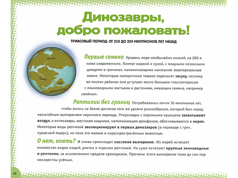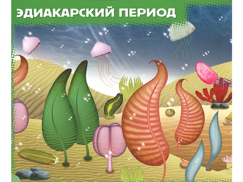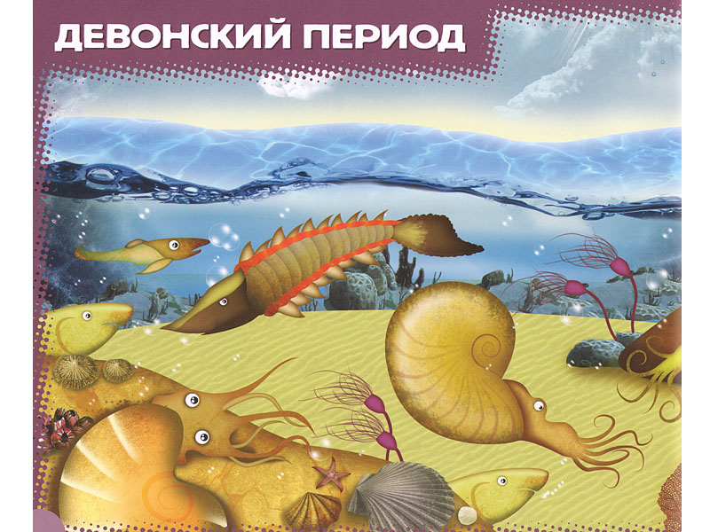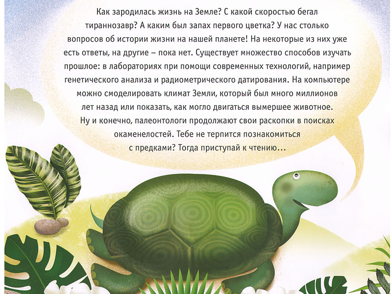 Автор «Истории жизни» именно так и делает – только не в текстовой части книги, которая как раз системно излагает теорию возникновения жизни, а в части изобразительной. Текстовые развороты перемежаются с живописными панорамами, в которых текста нет вообще (кроме названия исторического периода). И это и впрямь скорее живописно, чем научно: к примеру, микроскопические простейшие занимают столько же места, сколько и динозавры, и выглядят более чем декоративно. Но это именно то, что нужно ребенку, потому что живописность в данном случае решает важнейшую задачу – поразить воображение разнообразием жизни. Жизнь с самого начала предстает как нечто захватывающе интересное, и в то же время загадочное.