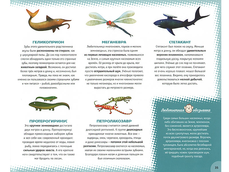 И, тем не менее, я осмелюсь утверждать, что книга Сандро Наталини подходит для общения с маленьким ребенком – благодаря своему визуальному ряду. Она вообще напоминает современный палеонтологический музей, и к этому образу сразу и недвусмысленно отсылают ее форзацы. А в палеонтологический или биологический музей вы можете прийти даже с маленьким ребенком, и ему будет там интересно. Почему? Потому что там есть на что посмотреть. А смотреть, разглядывать – важнейший способ удовлетворения познавательной потребности. Естественно, вы комментируете экспонаты, которые привлекают внимание малыша. Но это, как правило, происходит не «системно»: вы говорите, как называется то, на что он обратил внимание, и рассматриваете этот предмет вместе с ним. Стараетесь обратить внимание на какие-то детали, которые ребенок видит. Иногда объясняете, для чего они: это приспособление, чтобы передвигаться, это – чтобы ловить добычу, это – чтобы чувствовать температуру воды, и т.д. Собственно, для дошкольников (да и для младших школьников первого-второго класса) «системный подход» заключается, как бы странно это ни звучало, не в изложении строго научной последовательности происходящего, а в «знакомстве» с разнородными предметами, существами и явлениями. И это знакомство может носить совершенно бессистемный характер: что привлекло интерес ребенка, то и надо вместе с ним рассматривать, описывать (по возможности) особенности поведения (существования), ну и называть.
