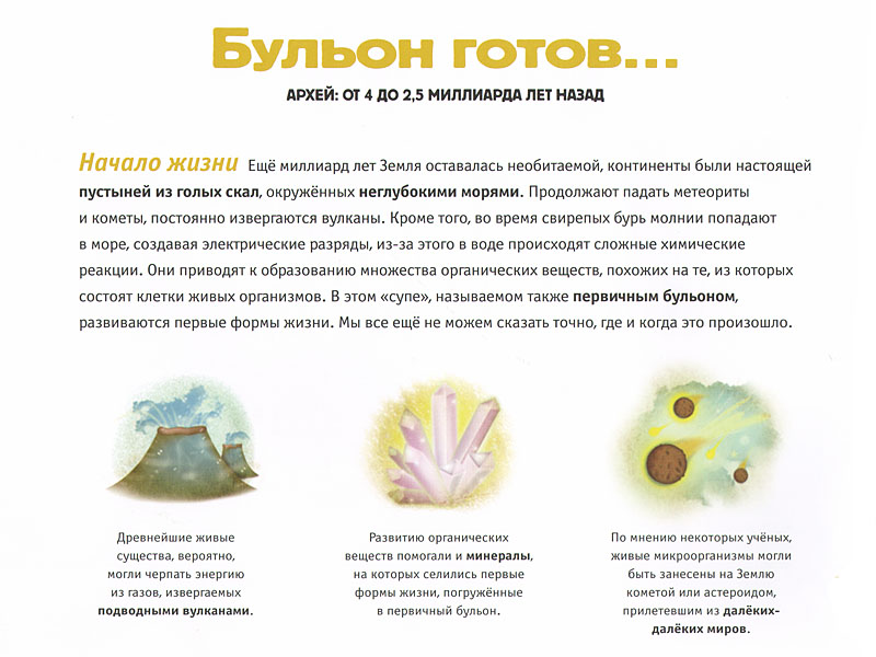 Текст книги, конечно, адресован более старшим детям ‒ он хотя и популярный, но строго научный и системно повествующий о появлении жизни на планете Земля. Воспринять такой текст адекватно могут разве что подростки. Он изобилует терминами: на одном развороте можно встретить и «тепловые процессы», и «горные хребты», и «формирование атмосферы», и «водяные пары»… Для маленького ребенка словосочетание «тепловые процессы» ‒ тема отдельной книги. А что такое «формирование»? Что такое «атмосфера»? Нельзя объяснять каждое слово ‒ это лишает чтение даже намека на удовольствие. Поэтому предполагается, что читателю это известно. По крайней мере, у него за этими словами что-то стоит, какие-то знания из физики, химии, геологии…