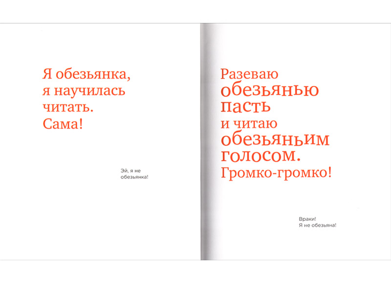 Казалось бы – ничего особенного. Тут шрифт изменился, здесь цвет… Но это сразу настроило Матвея на нужную волну. Благодаря резким перепадам в размерах слов, он безошибочно определял, где нужно говорить тихо (мелкий шрифт), где громко (крупный шрифт), а где и вовсе закричать (крупный шрифт и восклицательные знаки).