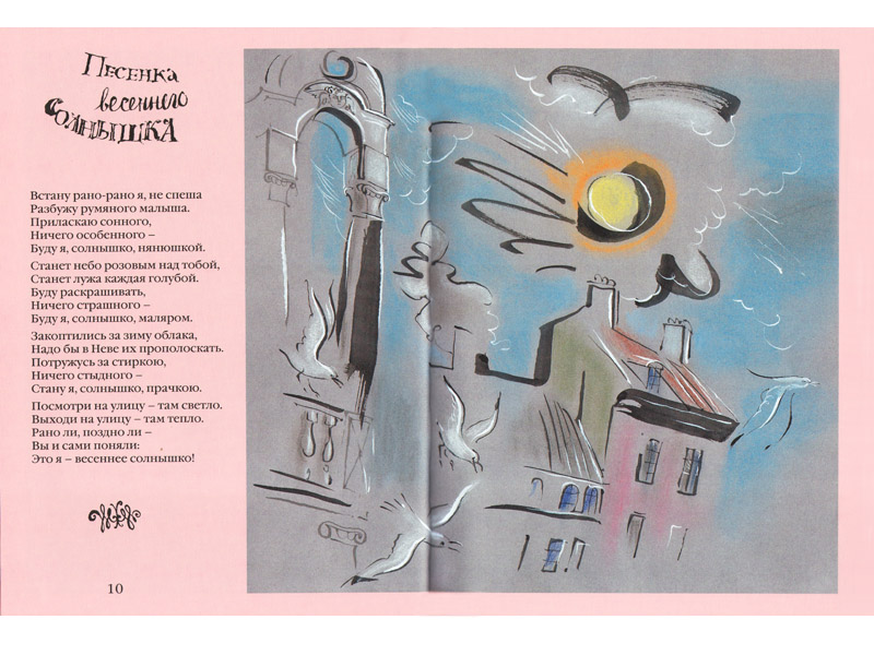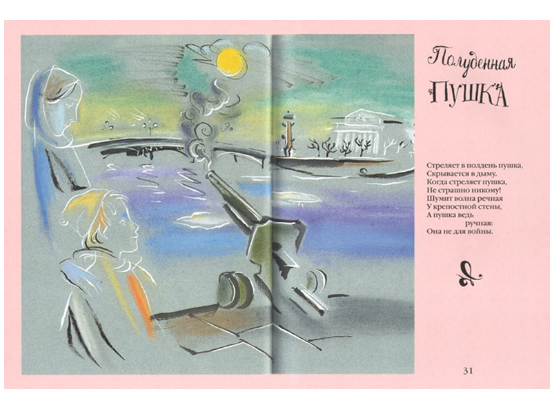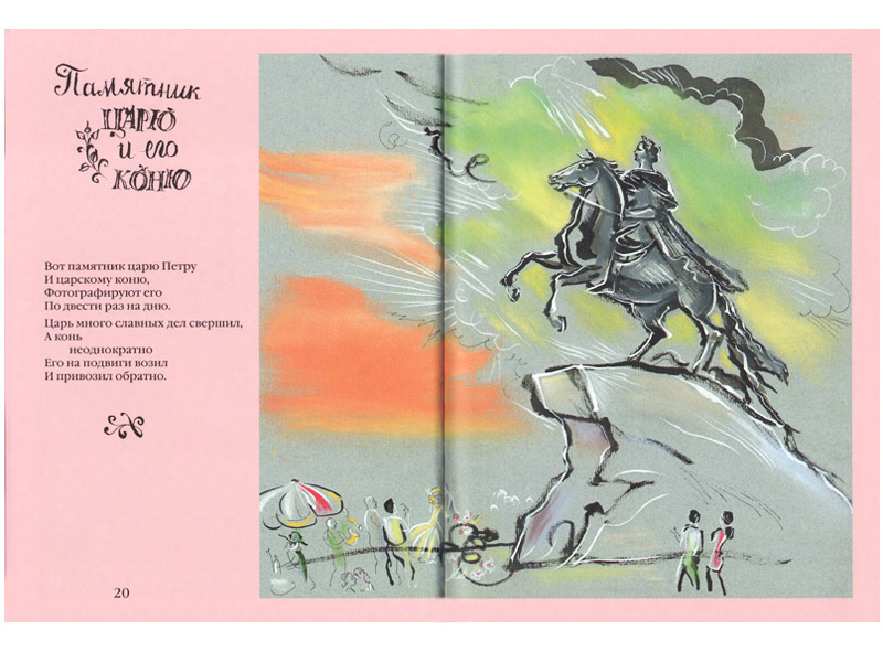 Сначала, наверное, читатель обращает внимание на стихи о достопримечательностях, ставших приметами Петербурга, но вот что неожиданно – описываются они весело, без всякой торжественности: «Вот памятник царю Петру / и царскому коню, / фотографируют его / по двести раз на дню», «Над грохотом и пылью, / над шумной суетой / плывет на тонком шпиле / кораблик золотой», «Мост нагнулся над рекой, / над водою ровной: / “Ах, красивый я какой! / Ах, какой огромный!”», «Стреляет в полдень пушка, / скрывается в дыму. / Когда стреляет пушка, / не страшно никому!»…