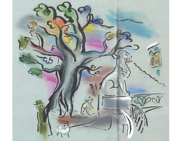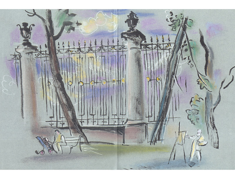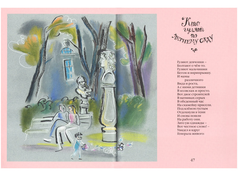 Добрая половина стихотворений в этом сборнике связана с Летним садом: «Летний сад на просушке», «Первые бабочки в Летнем саду», «Кто гуляет по Летнему саду», «Дедушка Крылов», «Дворец Петра», «Листья бегут»… И художники в нескольких деталях или вполне подробно изобразили «безупречную женственность Летнего сада», по всей видимости, особенно дорогую для Майи Борисовой. И даже форзац, предваряющий книгу, воспринимается как отсылка к известным ее строчкам: «Побужденье к восторгу – решетка, ограда, / а потом уж аллеи, скульптура потом…»