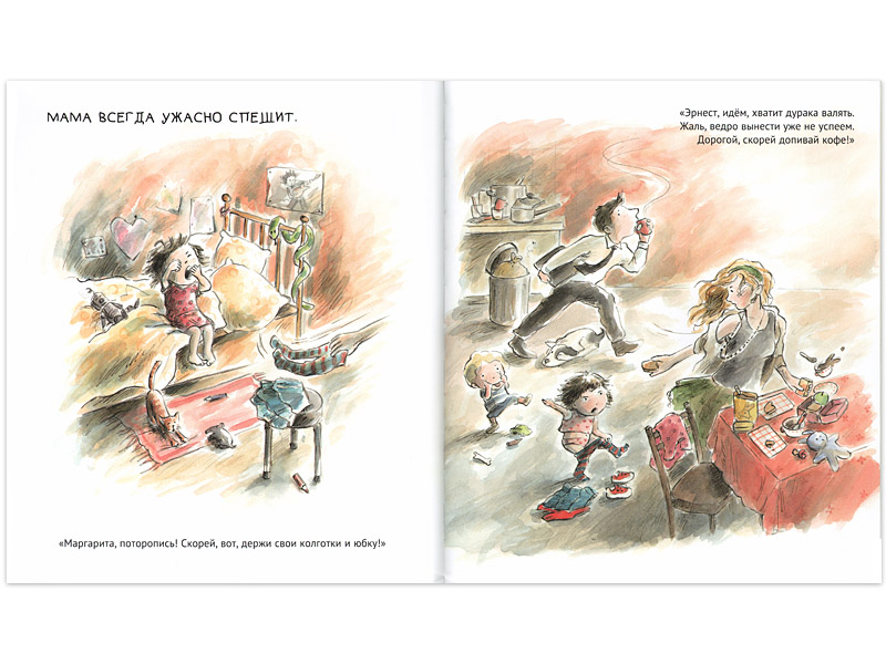 В книге до болезненного точно описывается работающая мама. Не просто работающая, а, видимо, успешная. Но «успешная» не означает, что ей просто живется на свете. Эта мама «всегда ужасно торопится», «не ходит, а бегает», «все делает одновременно». Не один ребенок узнает в такой маме свою, узнает описанные ситуации. И вспомнит, что он чувствует, когда мама опаздывает, нервничает и из-за этого ругается на ребенка. Так что чувства персонажей-детей из этой книги читателю дошкольного возраста будут хорошо понятны. Но дело здесь не только в «типичности» происходящего.