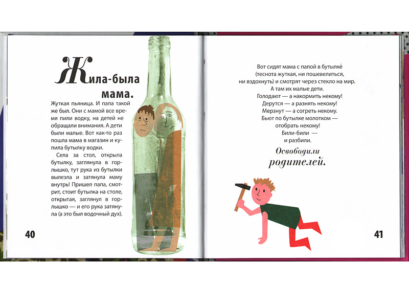 Я не знаю, что побудило экспертов из Мюнхена отметить седовскую книгу. Возможно, они приняли ее за остросоциальную литературу – в силу наличия «мамы – жуткой пьяницы», например. Хотя такая «остросоциальная» заточенность сюжета присутствует только в одной сказке. Но и она, как и остальные тексты, носит пародийный характер. И в некотором смысле их можно считать пародийным парафразом не только так называемых «народных сказок» (Сергей Седов использует характерные приемы «сказывания» – от устойчивых выражений и интонаций до алогичности и непредсказуемости сюжетных поворотов и «выводов»), но и классического советского стихотворения для детей ‒ про то, что «мамы всякие нужны, мамы всякие важны». Да, бывают самые разные мамы. Черт-те какие мамы бывают. И общее между ними лишь то, что у всех есть дети. Не бывает мамы без детей. Но отношения между мамами и детьми могут быть очень странными. Точнее, они только и могут быть странными. Если мама «жила-была», то уже все непросто.