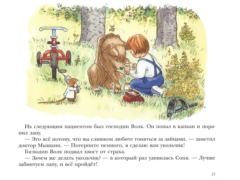 Уже две недели история про доктора Мышкина является нашим фаворитом по чтению. Это неудивительно, поскольку книжка очень игровая, а Ладе 3 года и больше всего на свете она любит играть и читать. Мало того что сюжет касается одной из самых популярных у детей тем, так он еще и рассказан совершенно в духе детских представлений о докторах, болезнях и их лечении.