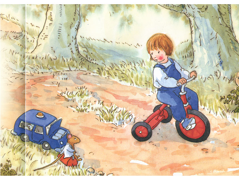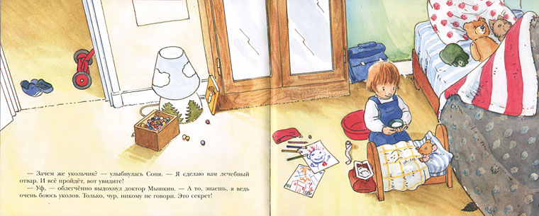 На последней странице текст и иллюстрации расходятся, показывая нам разную концовку: в тексте история заканчивается успокаивающими словами Сони, а на картинке мы видим комнату девочки, где на кровати лежат ее любимые игрушки (черепашка, волк, медведь), в дверном проеме виден велосипед, а сама Соня сидит с чашкой рядом с кукольной кроваткой, на которой заботливо укрыт мышонок. Эта иллюстрация обнаруживает игру, наглядно демонстрируя ее двойной план (воображение с опорой на реальность). Но сделано это настолько аккуратно, что воображаемая ситуация не разрушается.