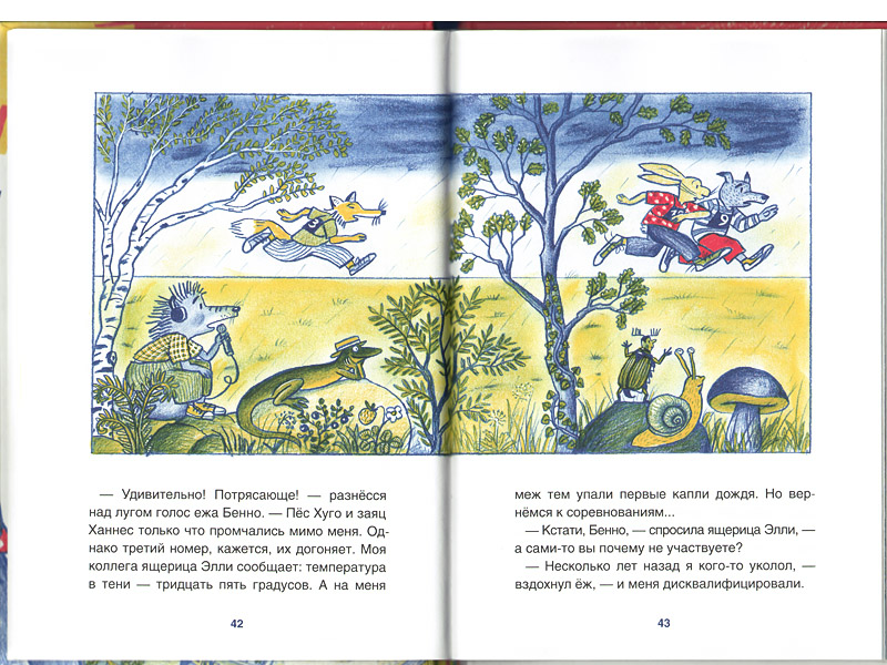 Книги Ротраут Сузанны Бернер – это обычно прежде всего картинки. И книги из ее серии «Городок» совсем освободились от текста и превратились в графические романы. Но «Пес и Заяц» ‒ книга другого ряда. Текст в ней есть, и он важен. И обращен к начинающему читателю, когда читать ребенку уже хочется, но в то же время хочется избежать утомления от слишком густо заполненных текстом страниц. Картинки и тут играют важнейшую роль.