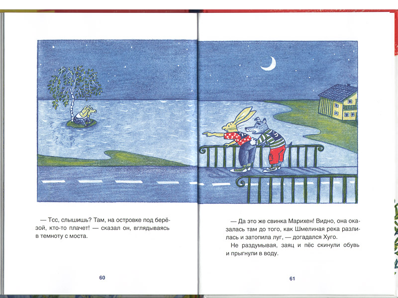 В результате и пес, и заяц оказываются в ситуации смертельной опасности, и им приходится помогать друг другу. Традиционные представления «о плохих псах» и «плохих зайцах» и о том, что между ними не может быть ничего общего, оказываются пустыми мифами. И хорошо, что Хуго и Ханнес могут ими пренебречь – иначе бы они погибли. А объединившись, они еще умудряются спасти заблудившегося малыша-поросенка. Кто мог подумать, что у псов и зайцев есть что-то общее с поросятами!