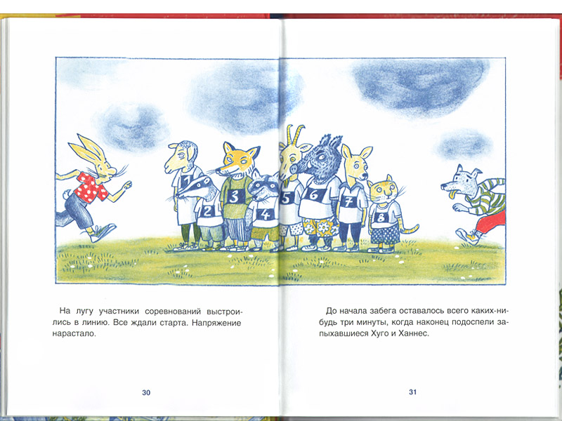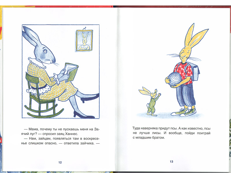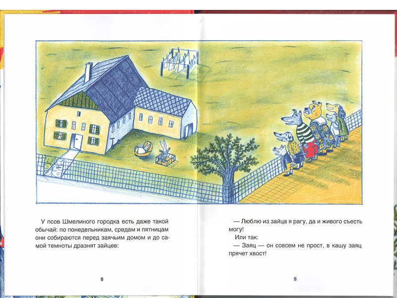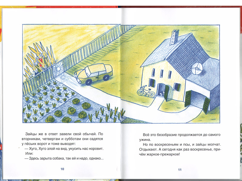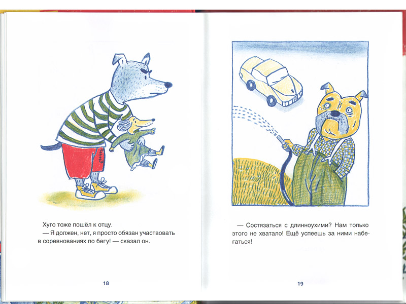 Картинок много, занимают они три четверти книги, и это узнаваемые картинки Бернер. По крайней мере, зайцы ее узнаются безошибочно. Они состоят в очевидном «родстве» с Карлхеном и его семейством. А псы и все остальные персонажи по манере рисования родственны зайцам. Но понять, в каких отношениях находятся эти псы и зайцы, без текста невозможно. Так что надо читать.