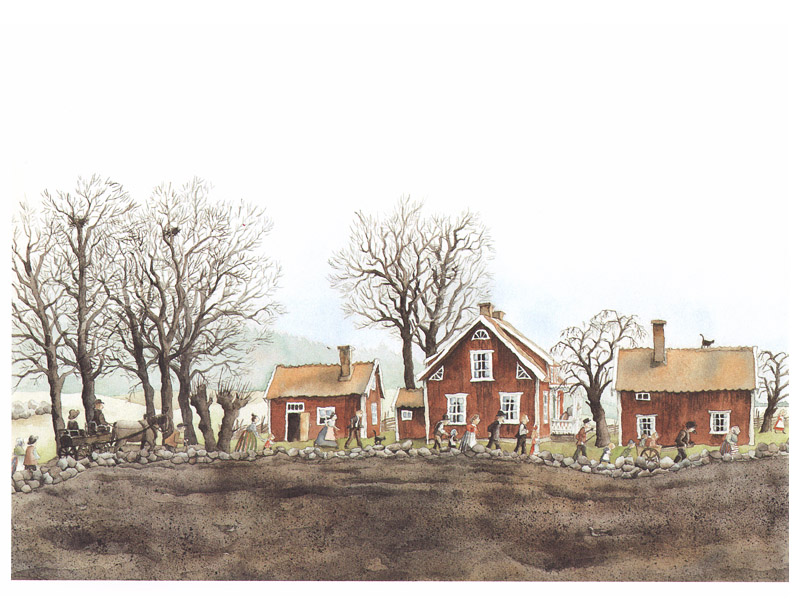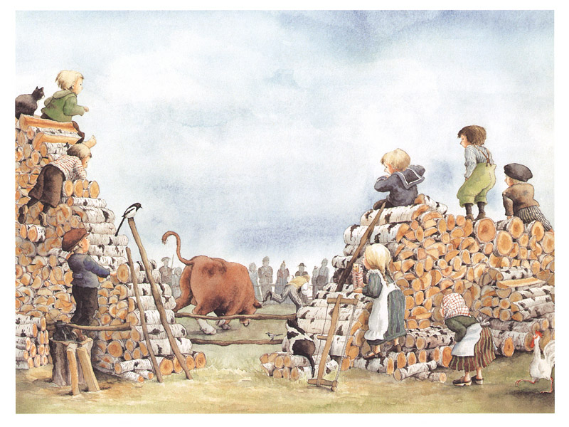 Но что же бык Адам Энгельбрект? Никто, даже сам хозяин, не может с ним справиться, и его собираются пристрелить, чтобы не нарушать покой пасхального воскресенья. И вдруг ‒ именно вдруг (стоп-кадр!) ‒ совершенно ниоткуда возникает спаситель, которого трудно даже представить в роли супермена: «Калле, маленький сопливый крестьянский мальчишка, которому едва исполнилось семь лет, сидел на ограде загона». Он описан и нарисован так, что и у самого маленького читателя не возникает мысли о том, что он что то сможет сделать. Ничем не примечательный малыш, который вместе со всеми прибежал поглазеть на невиданное зрелище. А между тем именно он делает то, что не удалось крепким смоландским фермерам – уводит разъяренного быка домой. Просто погладив своей грязной ладошкой между его рогов и пошептав ласковые слова. Это место в тексте кажется мне едва ли не самым важным посланием автора читателям: не смотри на то, что ты мал, решайся, не теряйся и все получится. Особенно, если приложить немного фантазии и смекалки. Для малышей с неустойчивой самооценкой эта книжка может оказаться не только интересной историей на ночь, но и своего рода вдохновляющей терапией, поможет поверить в свои силы при решении ежедневных житейских и творческих задачек. На это стоит специально обратить их внимание и поговорить об этом, как сделали мы.