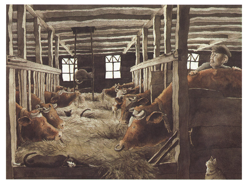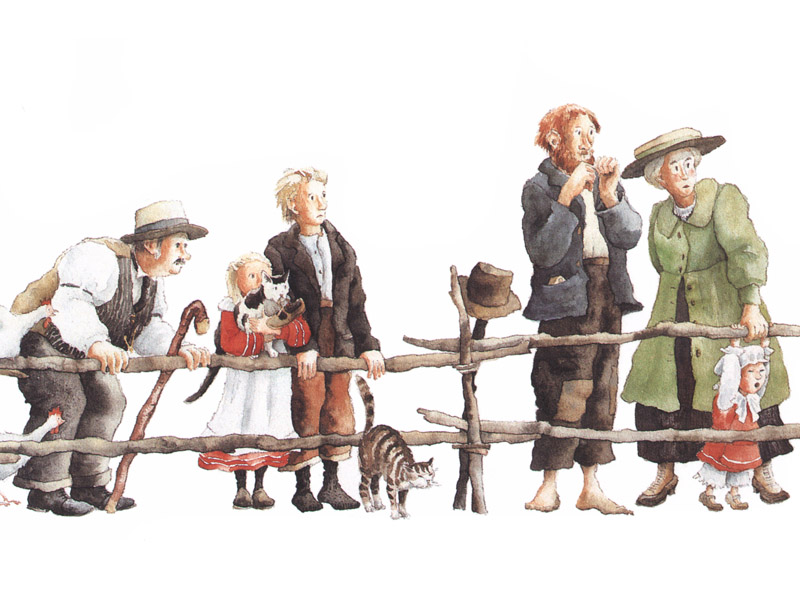 А через пару страниц возникает картинка – пауза, от которой веет покоем: семья фермера, хозяина быка, сидит за праздничным столом и ни о чем еще не подозревает. Мать, отец и шестеро белых головок. Вдох, выдох. Напряжение, охватившее и маленького читателя, спадает, он успокаивается, можно пока с удовольствием разглядывать пасхальный букет, домашнюю утварь, разбросанные под столом сандалии разных размеров, кошек, пестрый домотканый коврик. «В этот благословенный день стояла прекрасная погода, и малыши были счастливы...» Но по драматургическим законам жизни и текста снова требуется вдох. В идиллию семейного уюта врывается бешеный бык, и все домочадцы друг за дружкой бегут посмотреть, что случилось – папа, мама, братья, сестры, кошки, куры. Все соседи собрались у забора и наблюдают, а мы с детьми наблюдаем выражение их лиц, мастерски переданных художницей, и практически слышим гул возбужденных голосов. Выдох.
