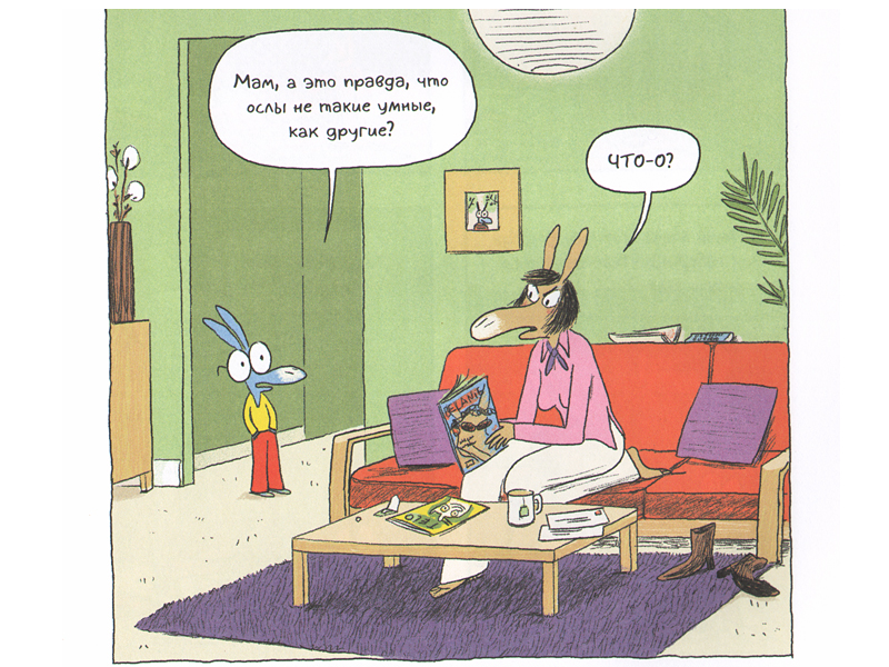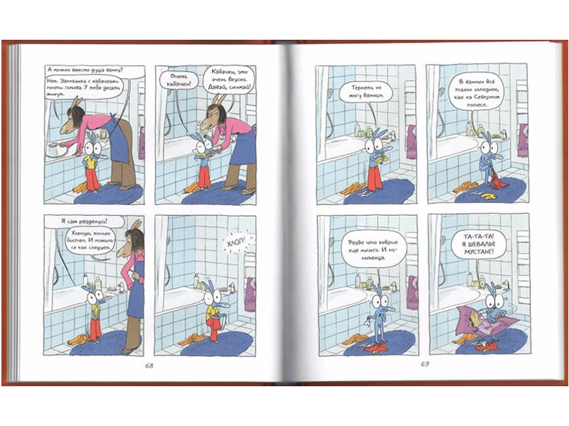 В этих комиксах очень подробная раскадровка – на одну историю отводится по десять страниц, на каждой ‒ по четыре картинки. Действие развивается неспешно, и диалоги очень напоминают разговоры в реальной жизни, настолько они подробные – как сценарий мультфильма или детская пьеса. Отдельное спасибо переводчику за живой язык и понятную ребенку интонацию. И да, в книге встречаются слова «дылда», «телек» (то есть «телевизор») и даже выражение «дать в морду». Но мы же не пытаемся делать вид, что этих, как и других разговорных или сленговых слов, не существует?