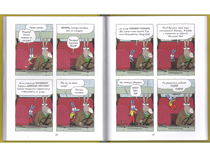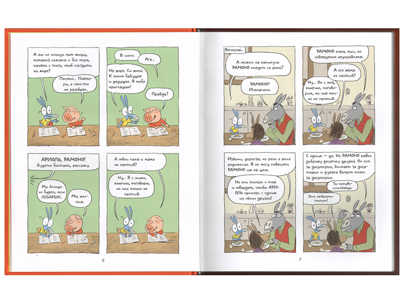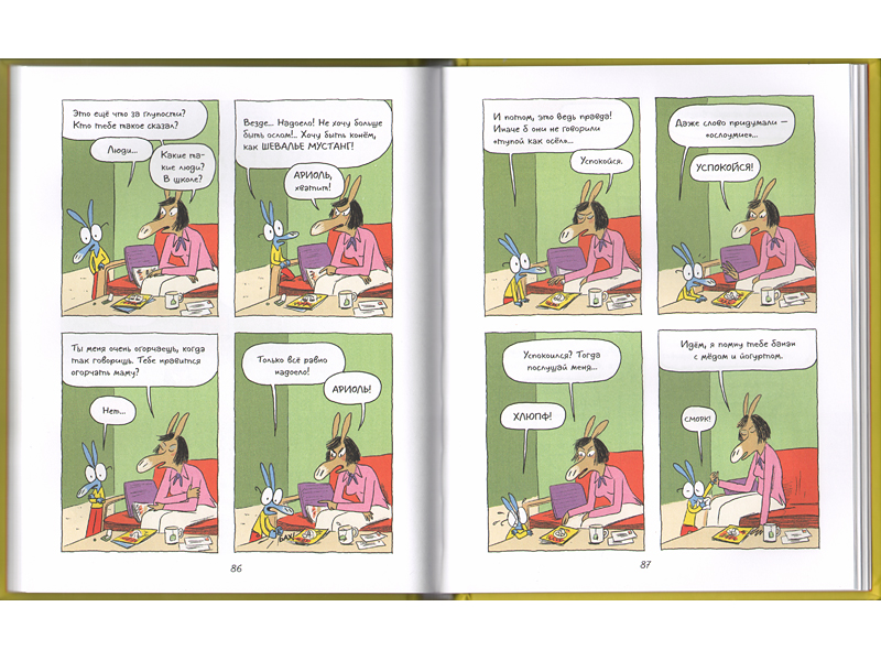 «Ариоль» был тут же утащен на продленку – он какого-то чудного, почти квадратного формата и идеального размера, ровно чтобы поместиться в детский рюкзачок. Мне эта затея казалась утопией: как же, куча детей вокруг, а Лева книжку читает. Верится с трудом. Но через несколько дней он вытащил из рюкзачка первую книгу, красную («Ариоль. Шевалье Мустанг»), и положил туда следующую, желтую («Ариоль. Маленький ослик, как вы и я»). Первую прочитал.