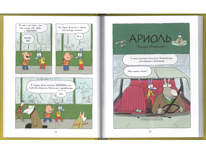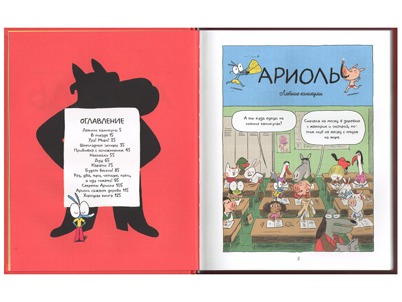 Выяснилось, что первой книгой как раз стоило бы считать желтую, «Ариоль. Маленький ослик, как вы и я», потому что там впервые появляются друзья и одноклассники Ариоля, а в конце книги есть их групповой портрет, где подписаны все имена. Очень удобно сверяться в процессе чтения, если вдруг по ходу сюжета кто-то не назван по имени. В классе вместе с осликом Ариолем учатся самые разные животные: смешная муха Бизбиль, поросенок Рамоно, кролик Финтифлю.