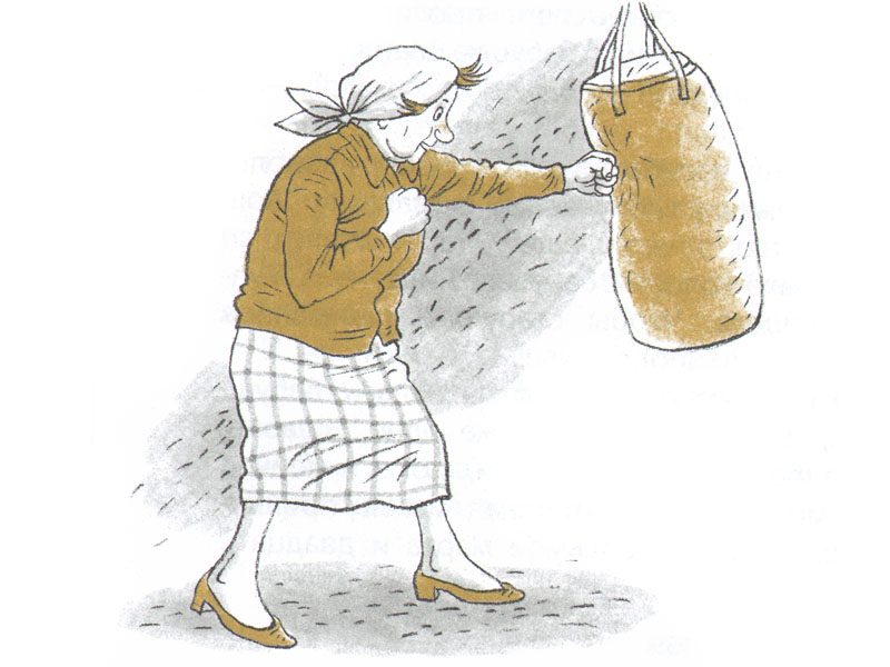 Пожалуй, это первая из прочитанных мною книг, где главный герой ‒ бабушка. И вроде бы это обычная милая бабушка, которая заботится о своих внучках и готовит «борщ и котлеты». На первой же иллюстрации мы видим, как бабушка Женя достает из духовки только что испеченные рогалики. А по вечерам она уходит в свою комнату под предлогом просмотра сериалов. Ведь каждая обычная бабушка смотрит сериалы. Но оказалось, что бабушка Женя ‒ «не обычная»: у себя в комнате она… достает из-за шторы боксерскую грушу и перчатки и начинает тренироваться.