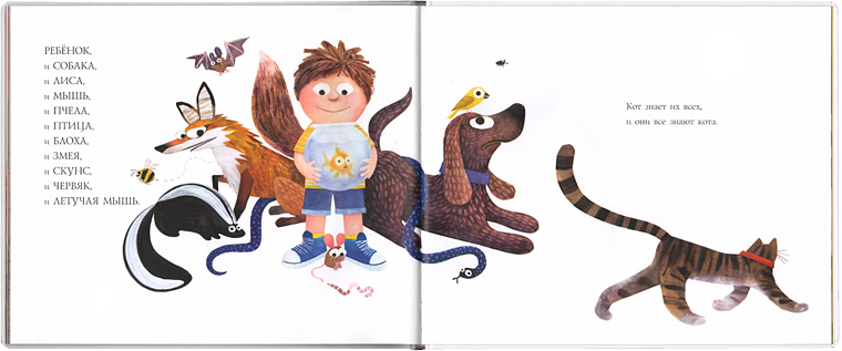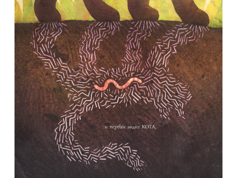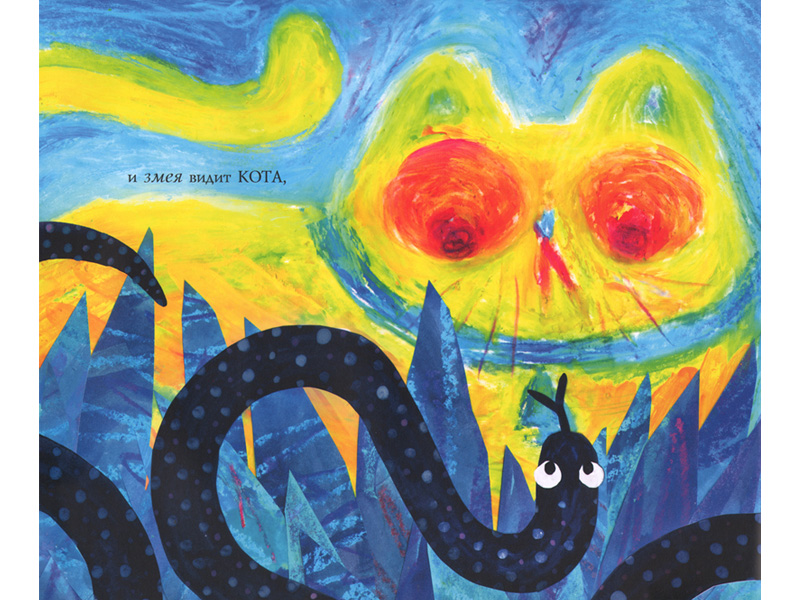 Идея Брендана Венцеля показать детям, как по-разному выглядит обычный полосатый кот с точки зрения мышки, птички, рыбки, ребенка, пчелы и даже червяка, безусловно, забавна и оригинальна. Она как бы переворачивает с ног на голову привычные представления о взаимодействии с миром. Главный герой книжки – кот, такой импозантный, полосатый, пушистый, каким он изображен на первой странице («Вот идет кот. Кот с усами, ушами и хвостом...»), и ребенок предвкушает начало кошачьих приключений, представляет себе гонки за мышкой или что-то подобное. Но оказывается, кот просто идет и ничегошеньки больше не делает, а его тем временем разглядывают все, кто попадается на его пути. И при каждой встрече кот предстает совершено разным: вытянуто улепетывающим от собаки, любопытно-большеглазым ‒ у ног ребенка, кроваво-красно-когтистым ‒ в глазах замершей от ужаса мыши. И уж совсем необычным – в виде теплового изображения (именно так его видит змея) или в виде звуковых колебаний земли (так его видит-слышит червяк под землей, пока кот идет над ним). А есть еще свое видение у скунса, у летучей мыши, у пчелы. И все они ‒ разные. А кот-то один и тот же! Вот и первое важное открытие, о котором, листая страницы книги, можно замечательно поговорить с малышом: разные звери (и люди тоже) могут видеть, воспринимать мир совершенно по-разному. И это так захватывающе и здорово! Брендан Венцель, по-моему, виртуозно воплощает эту идею с помощью красок и выразительных поз своих персонажей. Чего стоит одна только пушистая шерсть кота, поданная художником как целый клубок лиан. А ведь именно так она и выглядит с точки зрения блохи, прицепившейся к одной шерстинке.