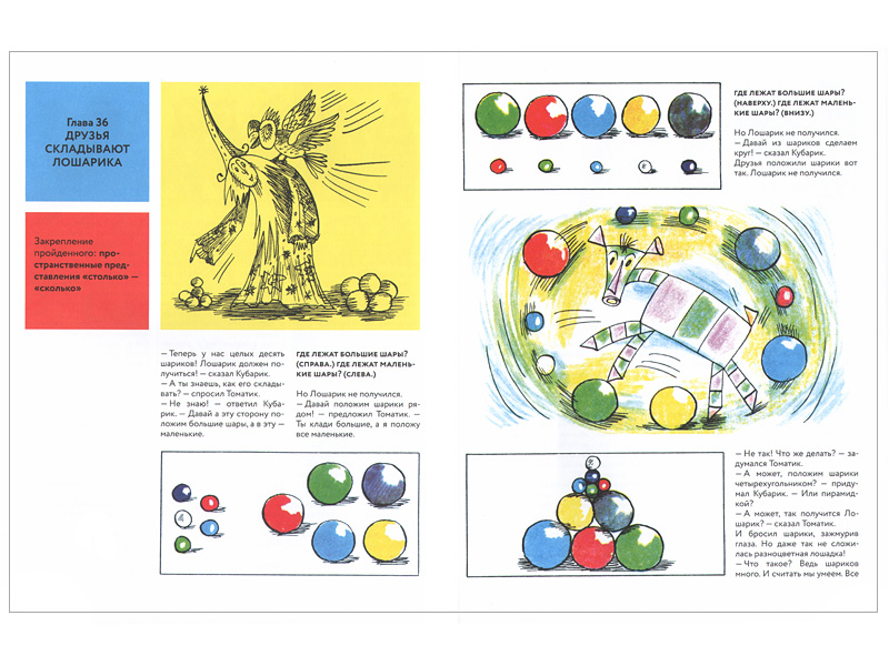 Когда мы закончили первую главу, и я немного волновалась, что услышу что-то типа «это для малышей, мне это слишком просто», я попыталась придумать и подсказать Лёве какое-то задание посложнее, чем те, что есть в книге. «Ну, подсчитай, из скольких шариков состоит Лошарик» (это такое замечательное существо, похожее на лошадь из воздушных шариков), – и получила радостный ответ: «А я уже подсчитал!» И дальше бодрый подсчет, пальчик скользит по странице так быстро, что я еле за ним успеваю: «9 + 1 это туловище, дальше 12, 14, 18, плюс хвост, всего 20». Я и не знала, что Лева так шустро ориентируется в том, что после десяти.
