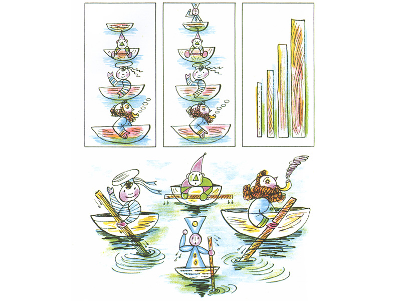 Разумеется, потрясающий язык Киры Сапгир, жены Генриха Сапгира и автора второй части, мгновенно заставляет забыть о малышах и о слишком простых для первоклассника заданиях. Мы просто читаем и наслаждаемся, смеемся и сопереживаем. И рисунки Виталия Стацинского тут тоже так важны! Ясные, четкие, иногда похожие на схему из учебника, но при этом так весело придуманные, такие яркие и понятные. С легкой долей сумасшедшинки – ровно такой, чтобы треугольная мышь с треугольного острова казалась удивительно органичной и правдоподобной.