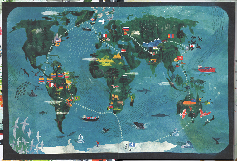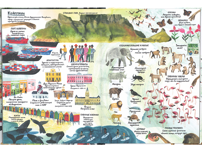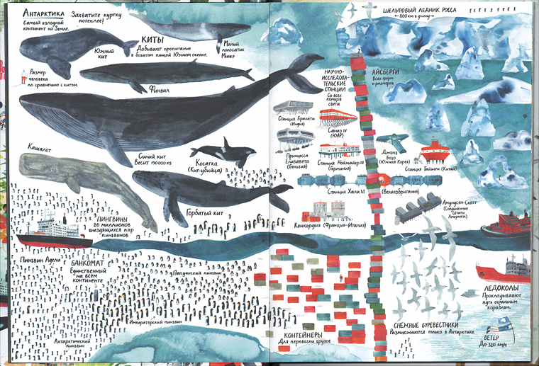 Само собой разумеется, в такой книге всего будет МНОГО – городов, экзотической флоры и фауны, самой неожиданной и разнообразной информации. К примеру, в Антарктиде внимательный читатель (а известно, что никто не разглядывает картинки в книгах так тщательно, как дети) среди россыпи мельчайших, словно муравьи, пингвинов заметит… банкомат! Удивительно, но факт: обыкновенный банкомат в единственном экземпляре установлен в этой бескрайней ледяной пустыне. Зато китов, айсбергов и научно-исследовательских станций здесь предостаточно.