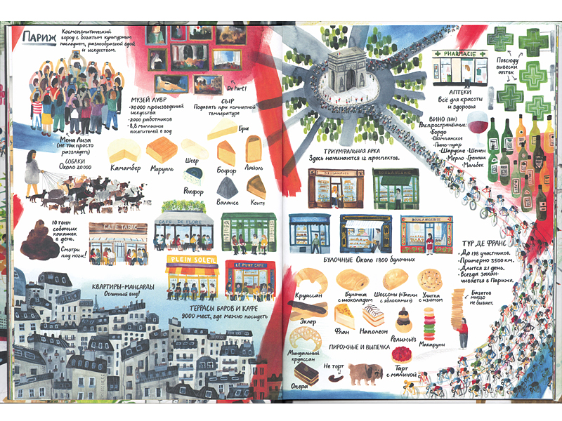 Я очень люблю книги с сюрпризами, и «МНОГО» – из их числа. На каждом развороте здесь есть загадка – «спрятанный» в картинке национальный флаг описываемой страны и человечек с рюкзачком, в красном свитере и синих штанах. Чтобы его найти, порой придется поломать голову (отличный квест для детей и родителей!), но тем интереснее процесс поиска. Запомните его хорошенько ‒ впервые он появляется в самом начале пути, рядом с предисловием автора. Собственно, это он и есть – художник-рассказчик, интригующий своего зрителя: «Сколько кошек живет в Каире? Сколько сыра съедает в день житель Парижа? Что за штука такая – “Пюльсусиннеп»?..”».