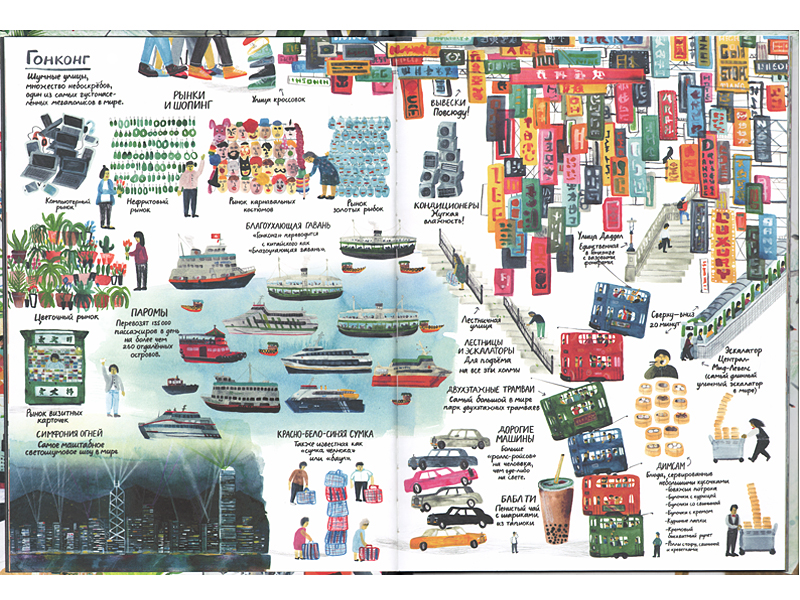 Интересно, что, по словам самого Марка Мартина, из пятнадцати отмеченных на карте мест он реально побывал примерно в половине. Поэтому, например, о вкусной выпечке в Париже или количестве лошадей в Улан-Баторе художник мог судить по своему опыту, а какие-то сведения ему пришлось получить из интернета, «гуляя» по улицам городов с помощью Google Street и сайтов о путешествиях. Есть у Марка в книге и любимый город – Рейкьявик, поразивший его цветовой палитрой домов и невероятными окружающими пейзажами. А еще, вероятно, таинственным пюльсусиннепом (по секрету: это всего-навсего исландский горчичный соус).