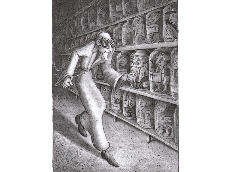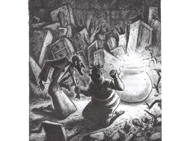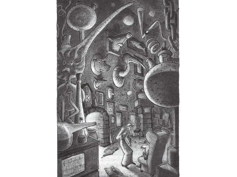 Интересно, что для меня злые персонажи оказались куда привлекательнее добрых. Мне очень понравился дом Заморочита. В его гигантской лаборатории много всяких скляночек, колбочек, веществ и препаратов. Там есть даже головы животных – акулы, бегемота, кабана. Я долго рассматривал иллюстрацию, на которой нарисована эта лаборатория. Еще в доме Заморочита есть большой музей, там в разных баночках законсервированы духи природы ‒ тролли, карлики, эльфы, русалочки, водяные, домовые, духи огня (саламандры) и даже буквоед. Всех их поймал сам хозяин и проводит на них опыты. Дом окружён невидимой стеной, которая вызывает у всех людей страх и неприязнь, и они испытывают сильное желание поскорее уйти отсюда.