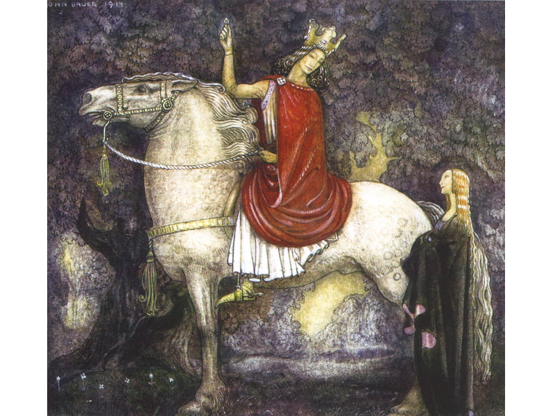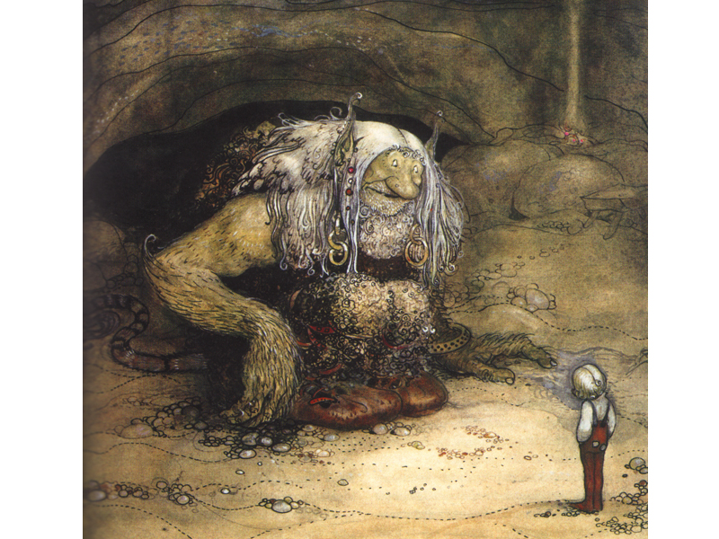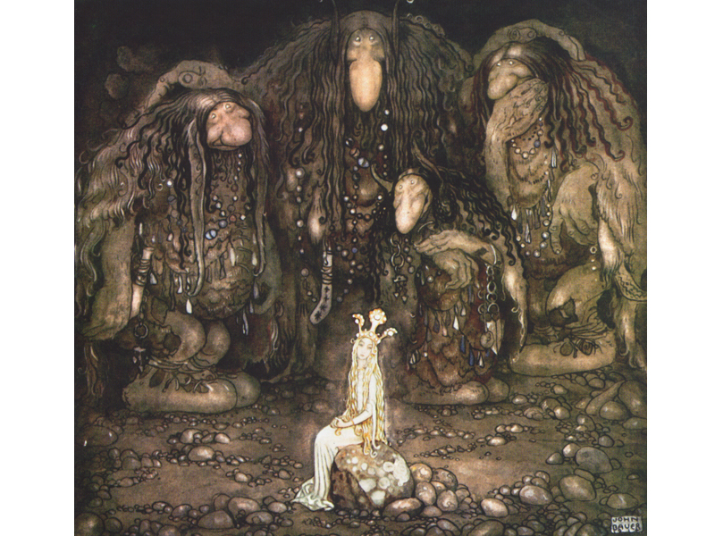 Йон Бауэр рисовал троллей так, как будто он сам их видел: с огромными руками, сгорбленными, лопоухими, носатыми – ужас просто! Из-под его кисти вышли также странные девы-хюльдры с коровьими хвостами и домовые в колпаках. Наверное, только среди долгой ночи могли родиться такие образы. В чем-то они все похожи на наших русских домовых, леших и русалок, а в чем-то совсем другие. Во всяком случае, троллей в русской языческой мифологии, кажется, нет.