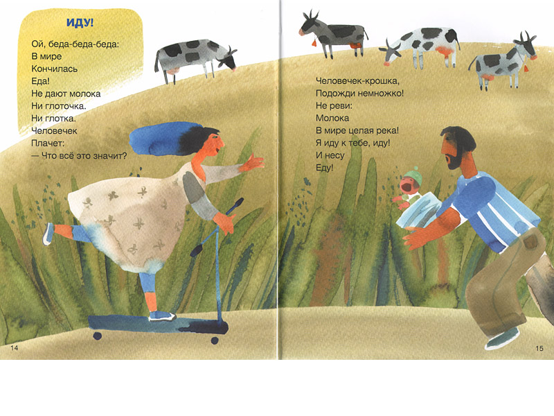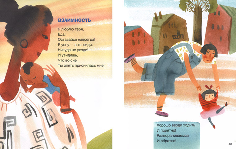 Кто станет главным героем сборника «Едет мамин человечек», понятно уже из названия. «В мире Я происхожу!» – с полным правом мог бы заявить этот малыш, если бы уже умел говорить. В центре маминого мира – он сам, его нахмуренный лобик, зацелованные пятки, первый зуб и первый шаг. Но и мама для него – целый мир, «река молока», помощь и утешение. Кажется, и спина маме дана именно для того, чтобы склоняться к «человечку» («Я хочу везде ходить – / Значит, вам меня водить!»), руки – чтобы качать «сонного сынка» или играть с ним, неспящим, в «ку-ку» («Солнце спряталось за тучки. / Мама спряталась за ручки»). И, конечно, грудь – чтобы кормить и успокаивать днем и ночью («Я люблю тебя, еда! / Оставайся навсегда! / Я усну – а ты сиди, / Никуда не уходи!»).