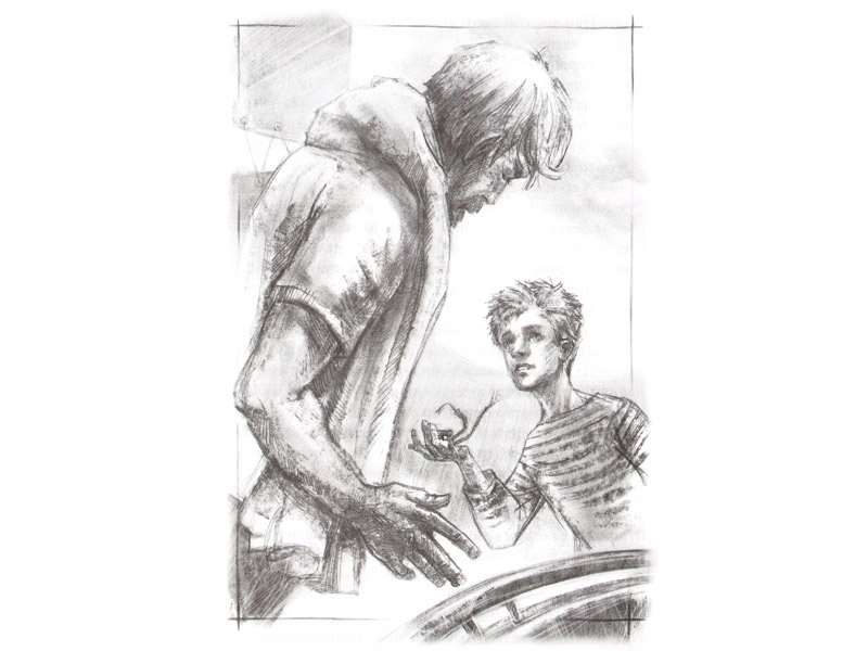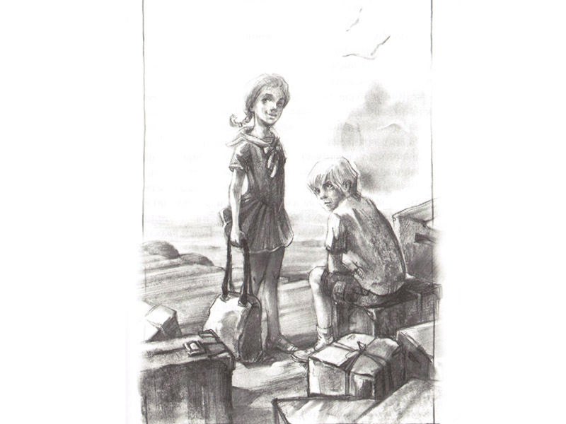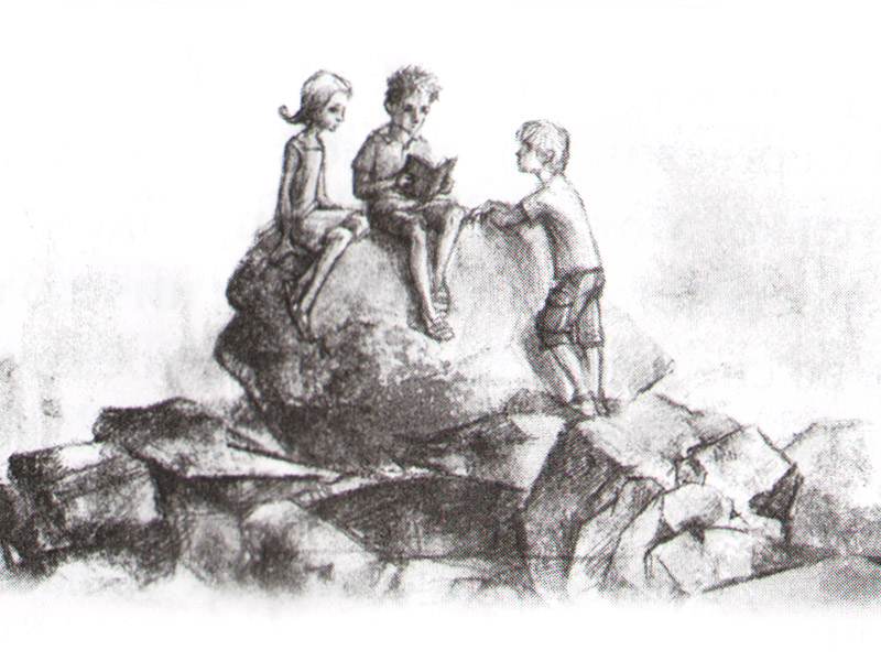 В книге много иллюстраций ‒ и небольших, и на целую страницу. Все они черно-белые, но при этом очень легкие, воздушные. И только на обложке художница Ольга Брезинская использовала нежный бирюзовый цвет, цвет моря и неба. На переднем плане мы видим наших героев, а на заднем плане изображен маяк, стоящий на скале. Мне показалось, что здесь не хватает дельфина, и я нарисовала свой рисунок.