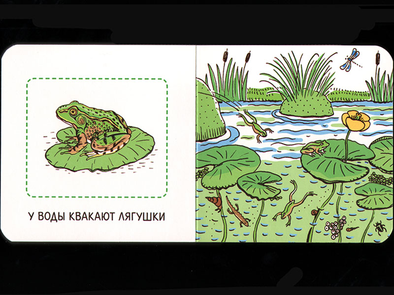 Так что книжечки сделаны с «запасом». Ребенок может разглядывать одиночный предмет, может искать отдельные предметы на сюжетных картинках, а может – с какого-то момента – и пытаться «прочитать» сюжетную ситуацию в целом.