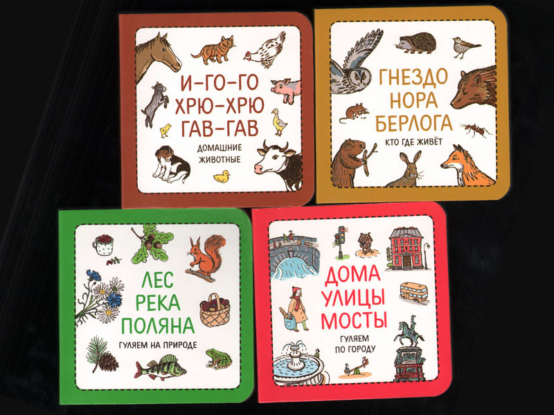 Отдельное удовольствие доставляет формат книжечек. Они целиком ложатся в руку. В руку взрослого, конечно. Но и взрослому должно быть приятно рассматривать книжки вместе в ребенком. Кроме того, такие книжки удобно брать с собой – и в дорогу, и в гости, и даже на прогулку: вдруг захочется посидеть на лавочке и отдохнуть от ходьбы? А тут – книжки. И картинки в них, вполне возможно, перекликаются с тем, что ребенок видит вокруг.