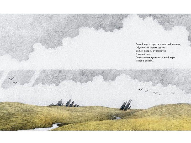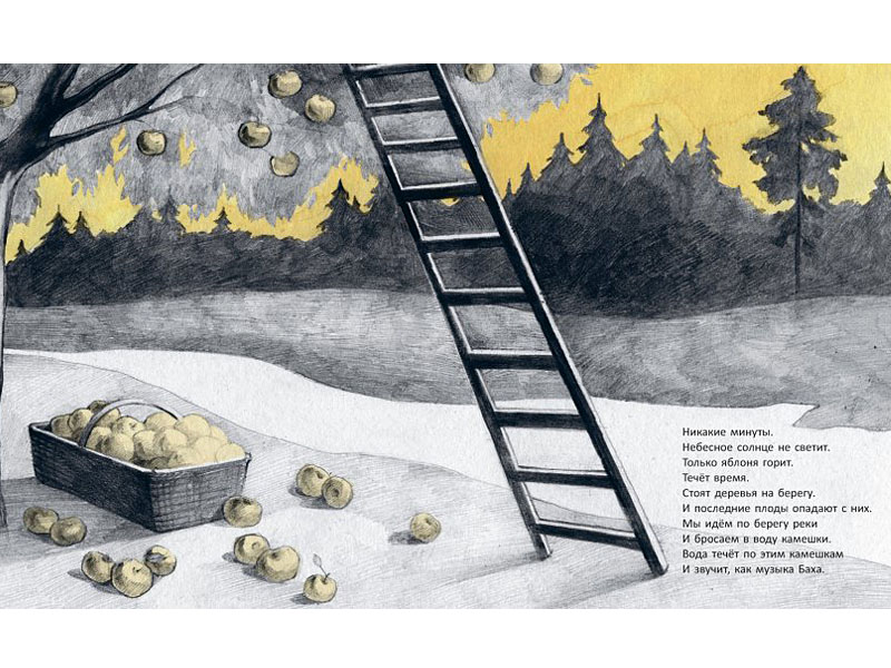 Здесь нет буйства красок. Художник использует всего два цвета: желтый и серый, но от этого иллюстрации не становятся беднее. Такой прием обращает внимание читателя на детали, на все нюансы оттенков. Рисунки Маши Судовых не заполняют пространство книги, а позволяют словам поэта жить и дышать, звучать и обращаться к читателю с разворотов страниц.