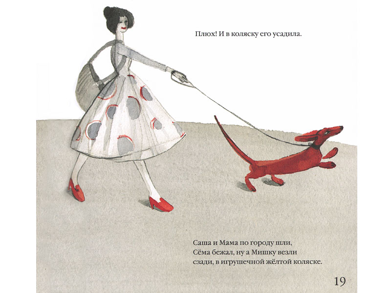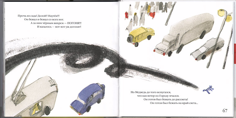 Пока она длилась, оптика все время менялась, это книга-спектакль, потому и читать ее нужно вслух, кому-то, читать и играть, слушать, превращаясь в девочку, в таксика, в мишку… В мишку, который чувствует себя то матрасом, то неизвестной ему самому тельняшкой, то пчелой – надо видеть этих разных «полосатых» вместе с ним. Ритм, речь в этой истории тоже меняются, как переживания мишки, как взгляд того или иного героя, и у меня весь день после того, как прочитала «Полосатого», крутятся в голове стихи Маршака («Плохо кошке пришлось в этой схватке, убегает она без оглядки...»).