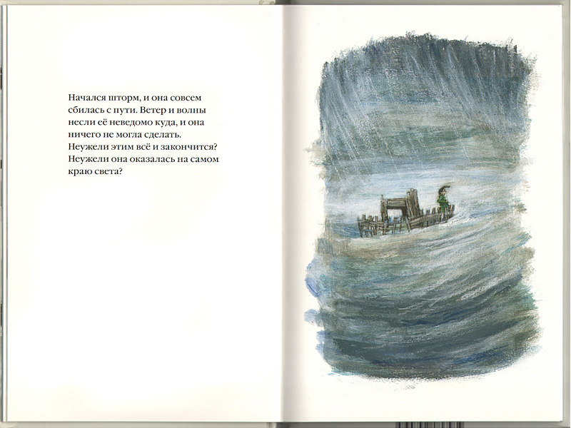 Очень мало текста. Иллюстрации – настоящие картины, очень красивые. Именно они рассказывают эту историю. Цветовая гамма иллюстраций и стая птиц, перелетающих со страницы на страницу, вызывают ощущение полета. Чувство свободного парения в чистом небе, согретом ласковым солнцем, возникает сразу, как только прикасаешься к обложке: фактура бумаги бархатистая, успокаивающая. Странно, но сюжет плавания по океану усиливает ощущение полета, а плавное, спокойное повествование как будто отрывает читателя от его реальной жизни.
