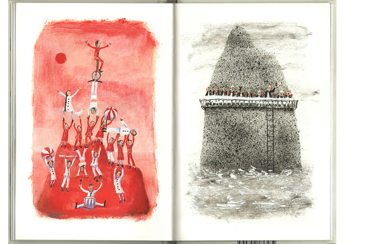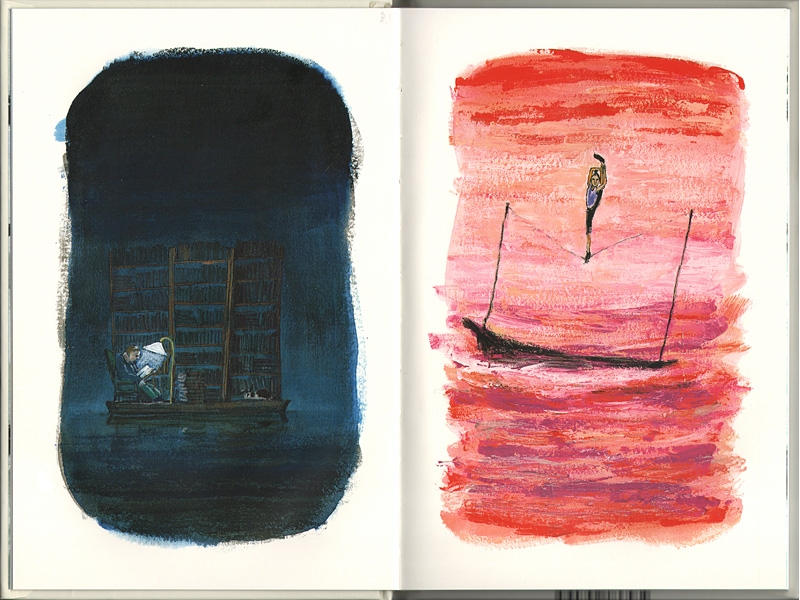 Эти рисунки дополняют текст, а часто даже говорят за него. Каждая деталь рождает ряд ассоциаций, каждое слово наполнено подтекстом. История начинается четырьмя строчками, висящими в чистоте страницы: «Девушка плыла по безбрежному океану на плоту, построенном из обломков разбитых кораблей». Слова «обломки разбитых кораблей» нарушают картину общей безмятежности, а соседство слов «океан» и «плот» вызывают ощущение ненадежности и беззащитности. Ноты нарастающей тревожности усиливаются красными оттенками иллюстрации.