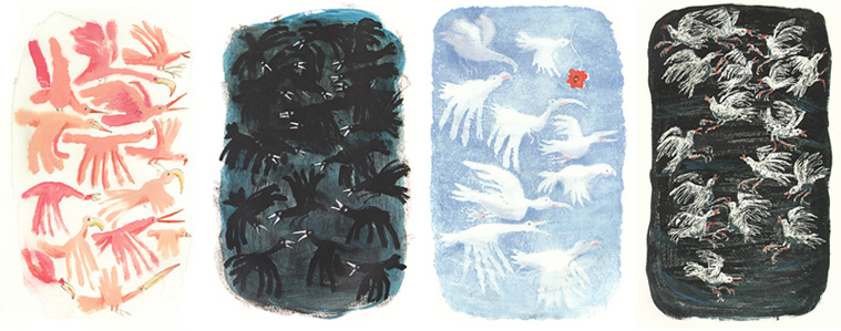Провожу рукой по гладкой поверхности страниц, всматриваюсь в мельчайшие детали рисунков: вот, держась за руки, гуляют человечки, в домах зажигается свет, люди пляшут и машут руками, плывут кораблики, прямо из воды вырастают острова, расцветает дерево с круглой кроной. И птицы. В начале истории – розовые, как вестники счастья, распахнувшие руки-крылья в полете. Затем ‒ угрожающе черные, сбившиеся в кричащую стаю, во время шторма на «самом краю света». Потом ‒ прозрачно-белые, бестелесные птицы-руки, летящие в сторону счастливого острова, и ‒ кричащие, нацарапанные на темном фоне «бессонных ночей», в странных изломанно-изогнутых позах, так созвучных состоянию героини…