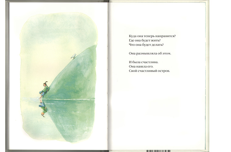 Страницы без текста – это продолжение сюжета, такое же легко прочитываемое, как и слова. Кажется, что никаких слов и не нужно. Некоторые детали говорят больше, чем слова, выражают больше смысла, потому что их нельзя понять однозначно. Чем внимательнее всматриваешься в рисунки, детали, позы, тем больше проясняется история ‒ будто выплывает из тумана или озаряется лучом восходящего солнца. О чем она? О девушке, плывущей на счастливый остров? О поиске счастья? О смысле жизни? О самоопределении и надежде? О смерти? О безграничном одиночестве человека, о случайных столкновениях людей-островов?.. Можно ли найти единственный смысл этого сюжета? И стоит ли? В этой истории, по-моему, отражается сам читатель. В зависимости от душевного состояния, отношения к миру, даже от возраста каждый увидит и поймет ее по-своему.