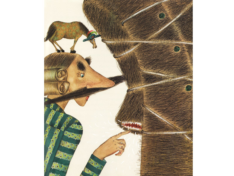 Раскладывающиеся карманы в иллюстрациях каждый раз воспринимаются как подарок, как волшебный сюрприз. Лева их все заранее изучил и заговорщически мне показывал: «Ну что, ты думаешь это просто белые медведи? Да-да, самые обычные белые медведи. А теперь смотри! Оп, там Мюнхаузен в шкуре медведя спрятался!»