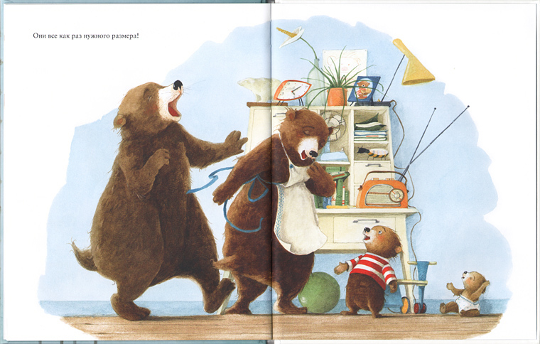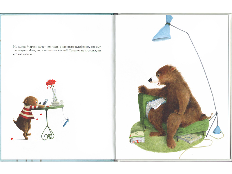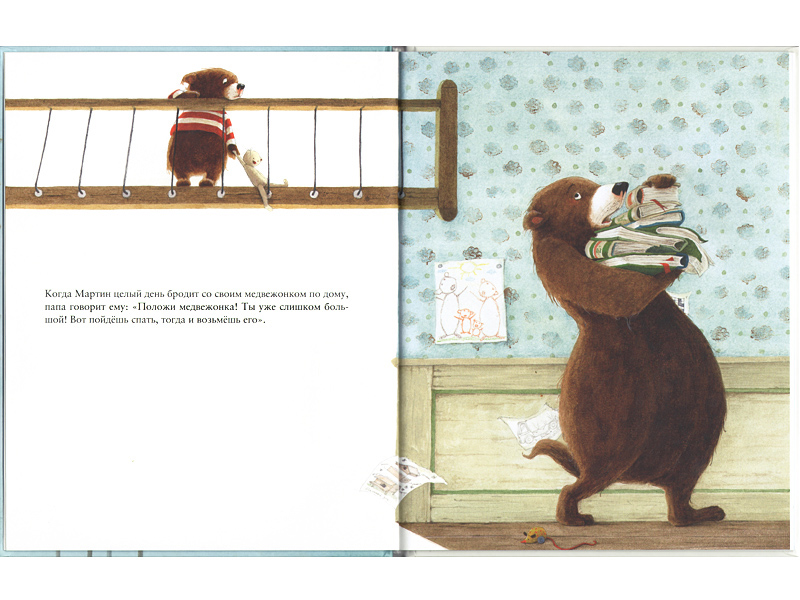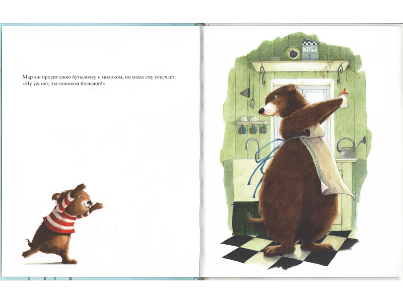Её вторая история под названием «Слишком большой, слишком маленький» заставила меня улыбнуться. Медвежонок Мартин постоянно оказывается для своих родителей то слишком маленьким, то слишком большим. Ему еще нельзя управлять машиной, ведь он слишком маленький, чтобы получить на нее права, но он уже слишком взрослый, чтобы играть с плюшевым мишкой. Родители противоречат сами себе, называя Мартина то слишком большим, то слишком маленьким, и медвежонок находит оригинальный способ показать своим родителям, что они тоже могут быть слишком большими или слишком маленькими для чего-то. Смотреть, как мишка на иллюстрациях с гордостью доказывает это своим родителям, очень забавно. Такой маленький, а уже такой сообразительный! Но приятнее всего, перевернув последнюю страницу, увидеть, что семья медведей счастлива ‒ ведь, как оказалось, чтобы смеяться всем вместе, они как раз нужного размера. Выяснилось, что и я тоже не слишком большая, чтобы читать эти чудесные и поучительные истории о медвежонке Мартине, которые помогают решить такие сложные, но очень важные и для ребенка, и для его родителей вопросы.