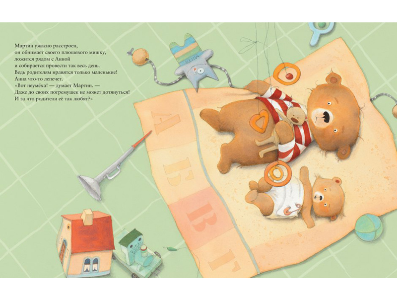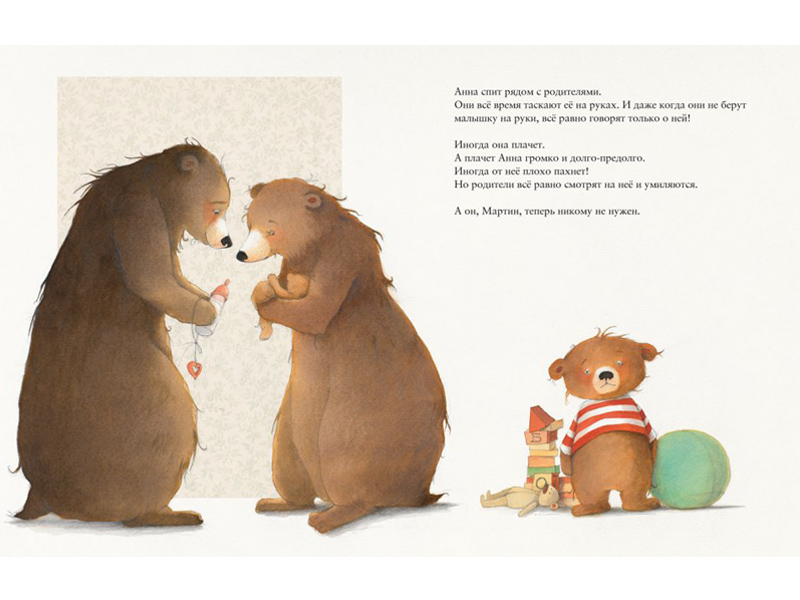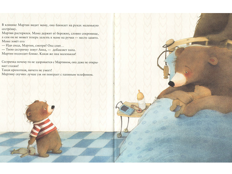 На русском языке вышло две истории под названием «У меня теперь есть сестрёнка» и «Слишком большой, слишком маленький». В первой книге у маленького медвежонка Мартина появляется сестренка Анна, и он начинает ревновать её к своим родителям, ведь теперь всё их внимание достаётся ей. Родители очень заняты, и медвежонку кажется, что о нём все забыли. Но любовь побеждает всё, и маленький Мартин понимает, что может многому научить свою сестру. Теперь он взрослый и ответственный медведь! Теперь он будет помогать своей сестрёнке и защищать её от опасностей большого мира. Читая эту историю, проникаешься уважением к Мартину ‒ ведь он научился ценить и любить свою семью.