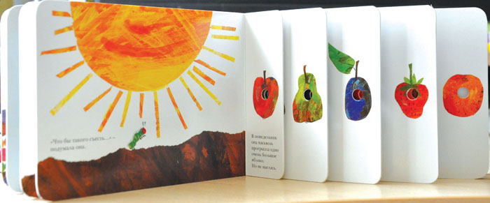In some countries—in Israel, for example—The Very Hungry Caterpillar is used to teach future educators how to introduce books to very small children. They have a whole method to discovering this book with little ones, finding new opportunities to comprehend the text and pictures. The Very Hungry Caterpillar first came out in Russia in 2008, published by “Pink Giraffe.” Despite parents’ reservations, it gained instant and immense popularity with progressive parents. Naturally, we want to know the secret of its success.