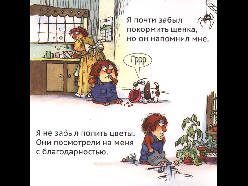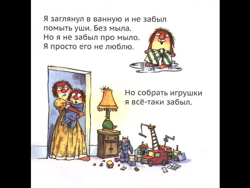 Вот лохматик утверждает, что «все может делать сам». Вполне узнаваемый детский максимализм. А Майер-художница показывает, что это утверждение, мягко говоря, не состоятельно. Вот лохматик перечисляет, чего он НЕ сделал из того, что вообще-то делать надо, и пытается найти разумное объяснение своему «неделанию»: «Я просто забыл!»