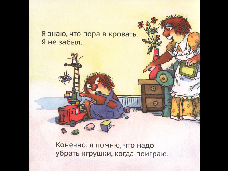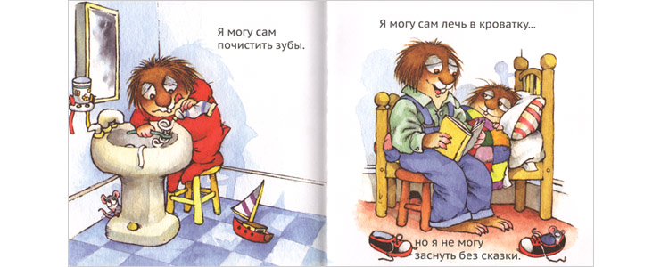 Лохматик может забыть что угодно, но только не то, что «надо позвать маму почитать перед сном». Другой вариант: лохматик многое может сам, но признается – «я не могу заснуть без сказки».