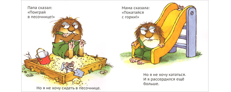 А вот история, где в лохматика, что называется, вселился дух противоречия. Ему кажется, что все вокруг против него: ведь все им недовольны, каждый чего-то не разрешает. Очень точное описание кризисного настроения: такое состояние хорошо знакомо и трехлетке, и младшему подростку лет с десяти. Но вообще-то плохое настроение, когда ты беспричинно капризничаешь, бывает у детей самых разных возрастов. И оно как почти беспричинно возникло, так почти беспричинно и кончится: стоит кому-то позвать тебя поиграть, и ты сразу забываешь, что готов был уйти из дома, забрав все свои игрушки.
