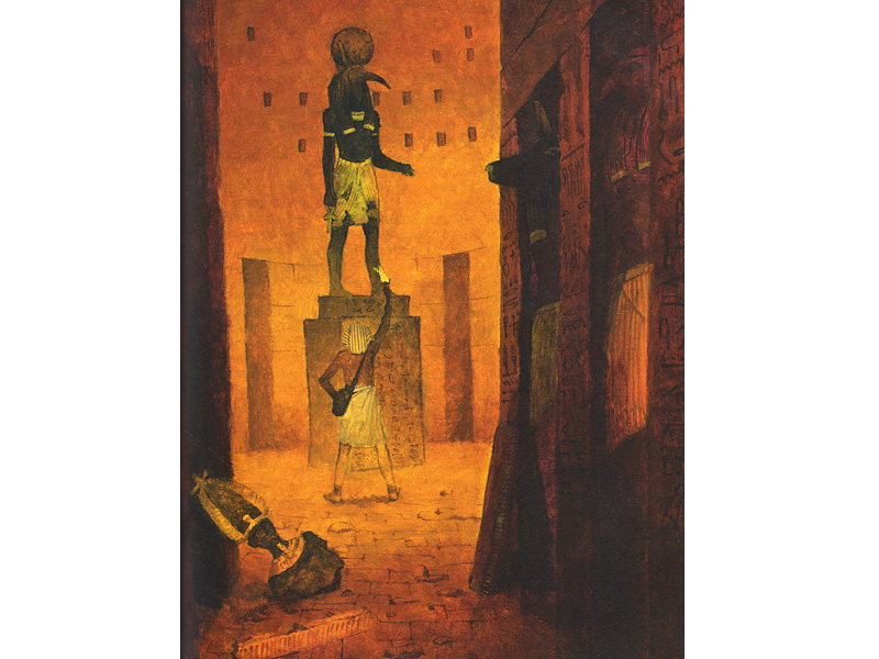 На форзацах нарисована стена древнего храма, состоящая из каменных плит. На некоторых из них вырублены письмена – древнеегипетские иероглифы. Мне очень понравилось то, как иллюстратор смог показать древность камня.