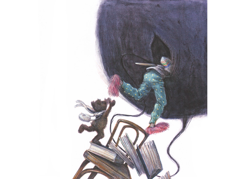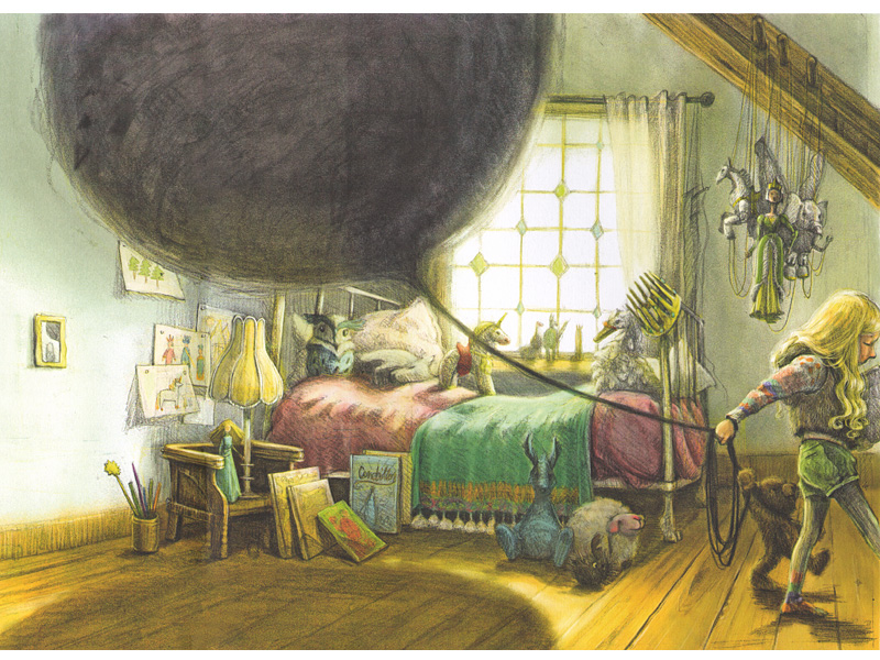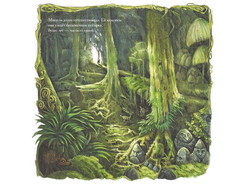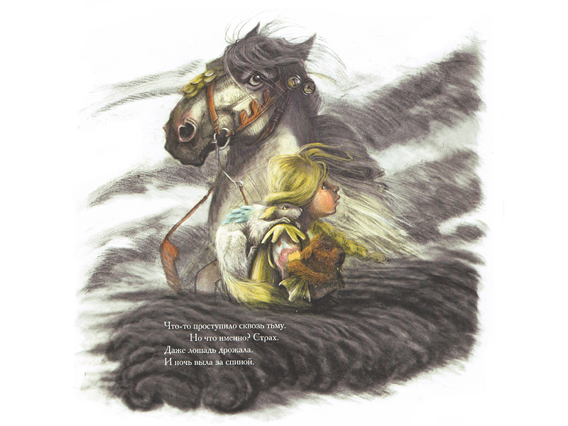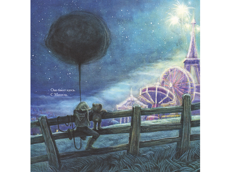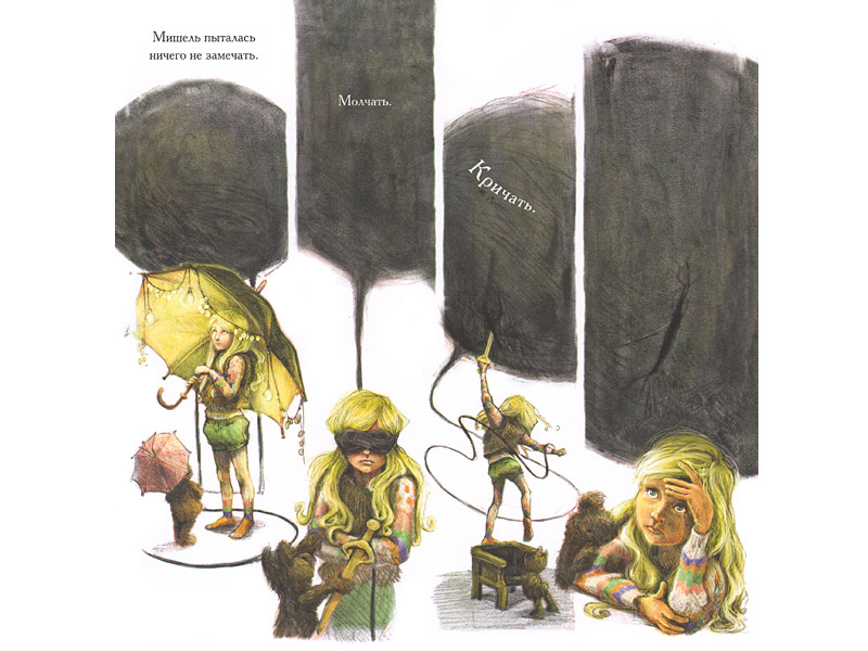 На картинках девочку Мишель преследует черный сгусток – то ли шар, то ли облако. Невозможно не почувствовать, как это ее угнетает. И однажды ночью (ночью!) Мишель решается проникнуть внутрь этого черного облака. Оказавшись в ирреальном мире, она и сама приобретает новые черты и качества – становится Героиней, девушкой-рыцарем, странствующей по диковинным местам. Один взгляд на эти фантастические пейзажи заставляет содрогнуться.