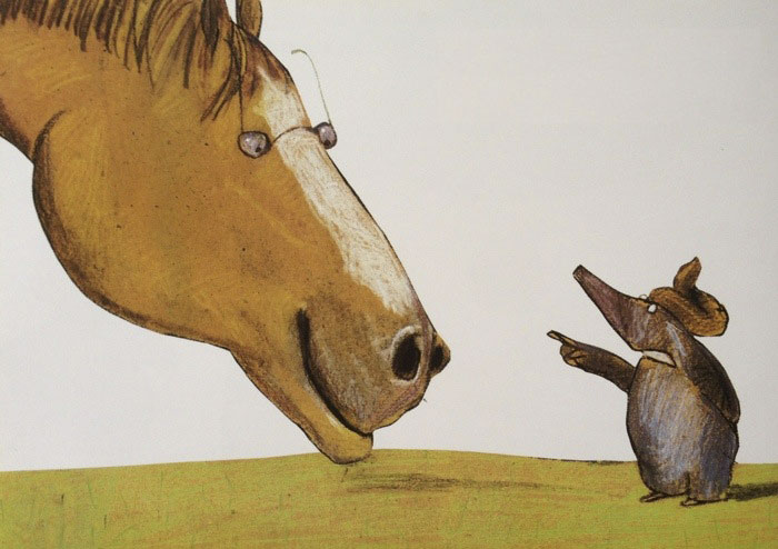 If six months ago someone had told me a little book about a pooping mole would be a favorite in our home, I wouldn’t have believed it. I did not intend to buy Wolf Erlbruch’s and Werner Holzwarth’s The Story of the Little Mole Who Went in Search of Whodunit US edition: Abrams Image, 2007. (published in the UK under the title of The Story of the Little Mole Who Knew it Was None of His Business By Pavilion Books. ) at all, ignoring its mention in articles and reviews. There are so many great children’s books in this world and I wasn’t about to waste precious time on a mole and some poo.