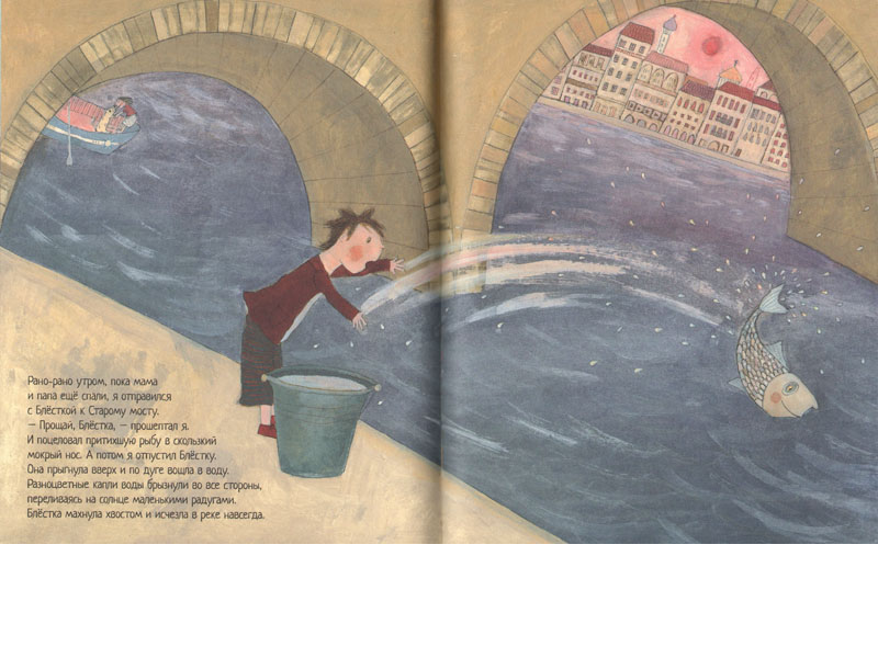 Миша назвал рыбку Радугой. Замечательная картинка: Миша и Радуга смотрят друг на друга сквозь стенки аквариума, соединившись носами – Миша снаружи, рыбка изнутри. «Я был так счастлив! Этой ночью мне снилось, как я путешествую на гондоле по Венеции со своими друзьями: Блесткой и Радугой», – так заканчивает свою историю Миша. И этот сон тоже отлично нарисован: Блестка, как буксир, тянет гондолу, в которой сидит Миша, прижимая к себе круглый аквариум с Радугой.